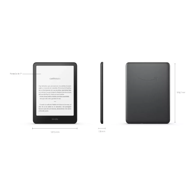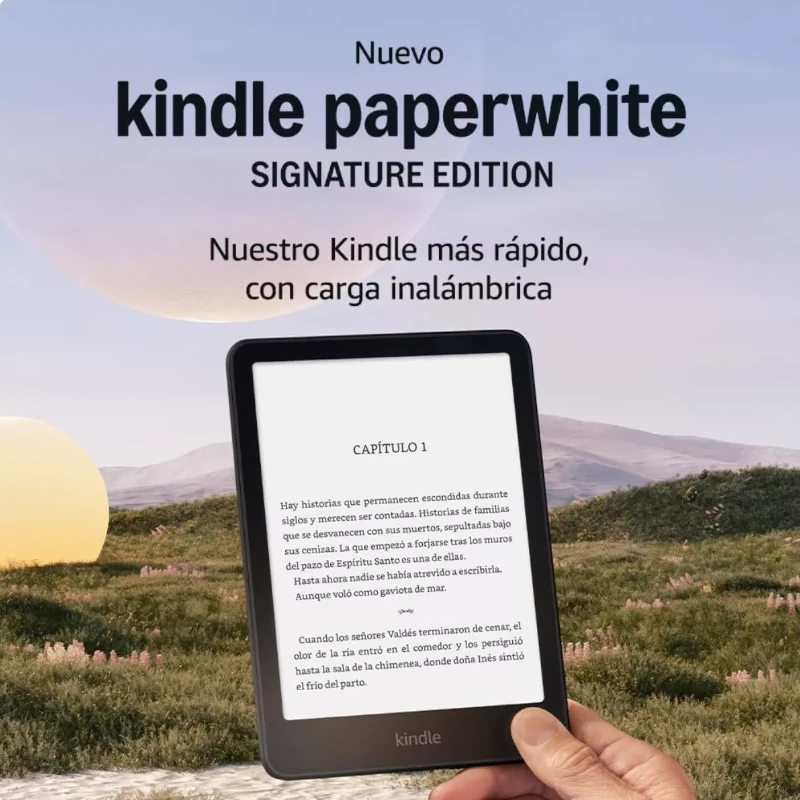 La nueva generación de Kindle Paperwhite Signature Edition cuenta con una pantalla de 7” con mayor contraste y pasos de página un 25% más rápidos. Su diseño ultraligero es ideal para leer bajo cualquier luz, con una pantalla sin reflejos y luz frontal autorregulable. Además, cuenta con una batería que dura hasta 12 semanas con una sola carga y es resistente al agua, lo que lo hace perfecto para leer junto a la piscina o en la bañera.